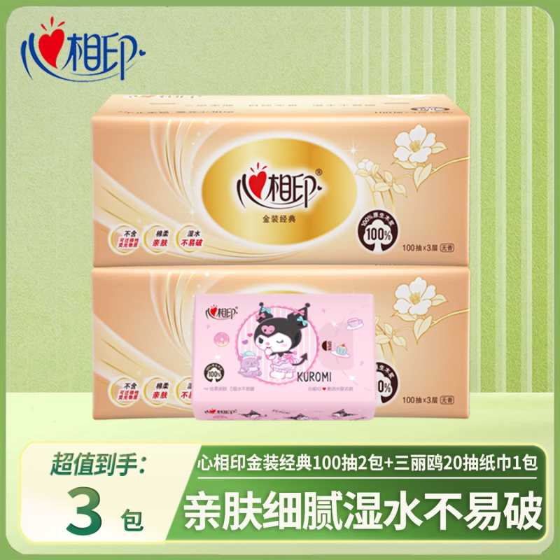 心相印抽纸金装经典餐巾纸三层100抽家用卫生纸亲肤柔韧不易破