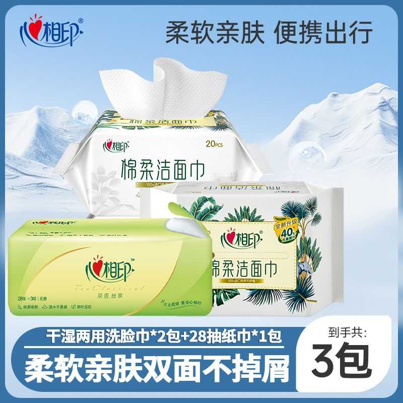 心相印棉柔洗脸巾一次性面巾纸20抽干湿两用加厚双面湿水不破
