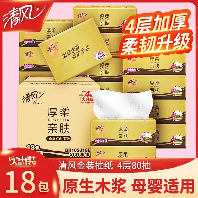 清风抽纸金装4层加厚纸巾卫生纸面巾纸大包亲肤柔家用餐巾纸实惠