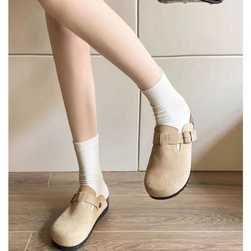 加厚软底~全牛皮勃肯鞋女软木百搭平底钓鱼博肯鞋真皮包头半拖鞋