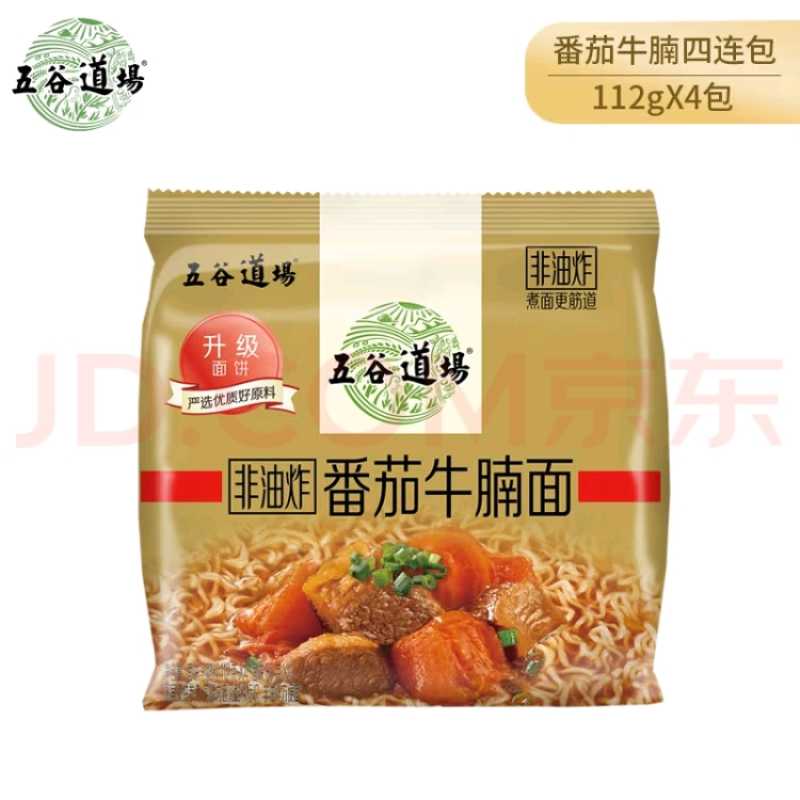 五谷道場非油炸方便面 骨汤蔬菜番茄牛腩面四连包112gx4袋 免煮早餐泡面